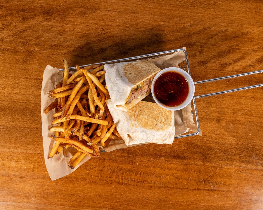 Burger topped with Housemade Birria | Oaxaca Cheese | Chopped Onion & Cilantro | Wrapped in a Tortilla | Consome Side