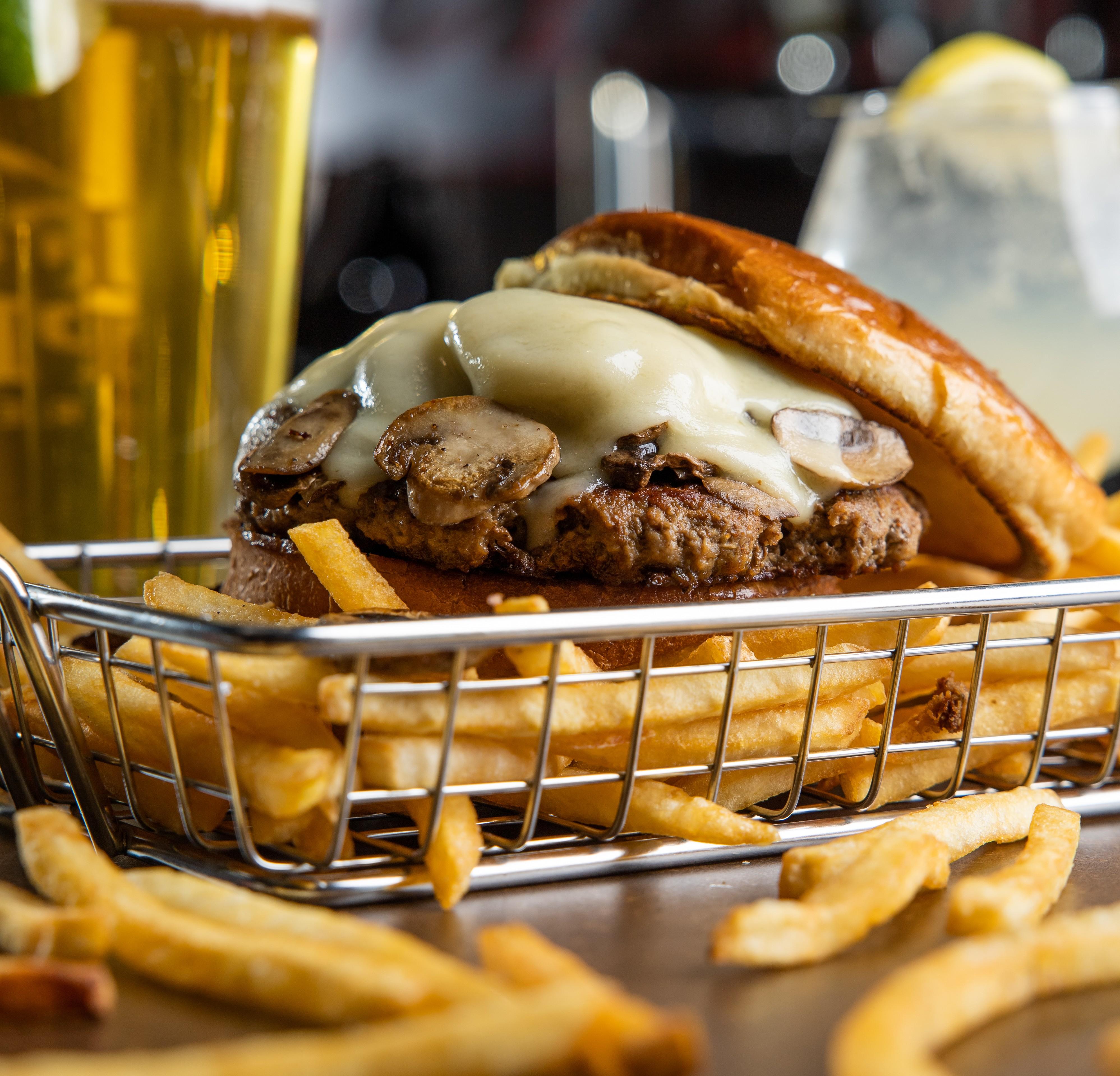 Burger topped with Shaved Rib-Eye | Monterey Jack Cheese | Grilled Green Peppers | Grilled Onions | Housemade Jalapeno Cheese Sauce